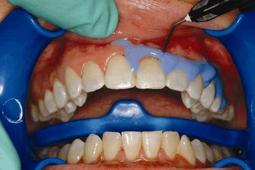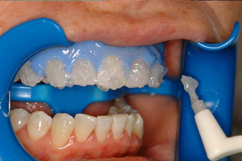 - Application - Next a high-strength whitening gel is applied to the surfaces of your teeth. This special gel is specifically designed to work with the whitening light.